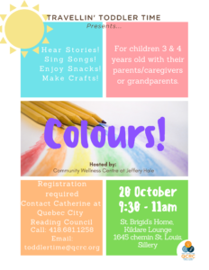 Travellin’ Toddler Time (TTT) is free activity in English for children 3 and 4 years old and their parents/caregivers or grandparents. Participants sing songs, hear stories, make crafts and enjoy a snack. This activity is run by the Quebec City Reading Council ( QCRC) and the location rotates every month. Be sure to check the location for each activity.